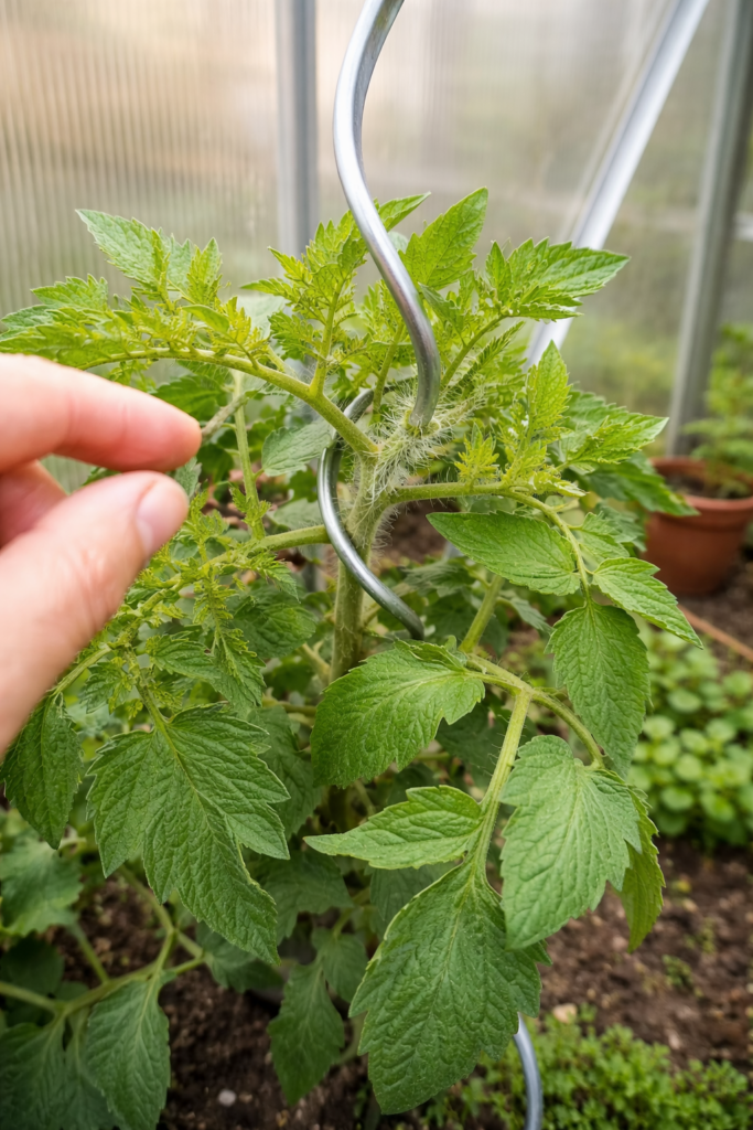 Als de plant flink begint te groeien is ondersteuning wel echt belangrijk. Dit kan door middel van een stok , rek of touw. Bind de tomatenplant niet al te straks aan de ondersteuning terwijl hij groeit. Nu kan de tomatenplant weer rustig verder groeien. Je kan in het tuincentrum ook speciale tomatenspiralen kopen. Dit zijn metalen spiralen die je in de grond kan zetten of kan ophangen. Daar kan je de tomatenplanten om heen begeleiden zonder ze vast te hoeven binden.