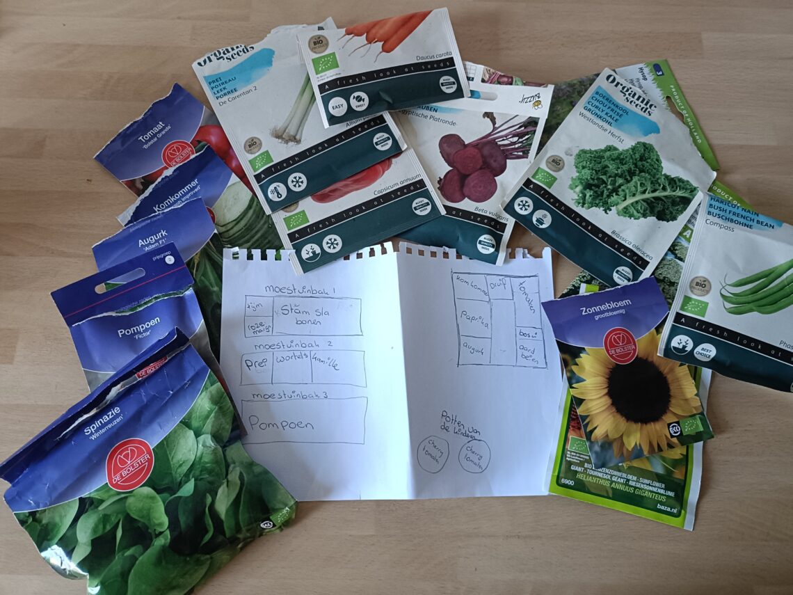 Daarna bedenk ik wat ik dit jaar eigenlijk allemaal wil gaan zaaien en dit schrijf ik op een lijstje. Nu ga ik op zoek naar de combinatieteelt van de soorten die ik heb uitgekozen.