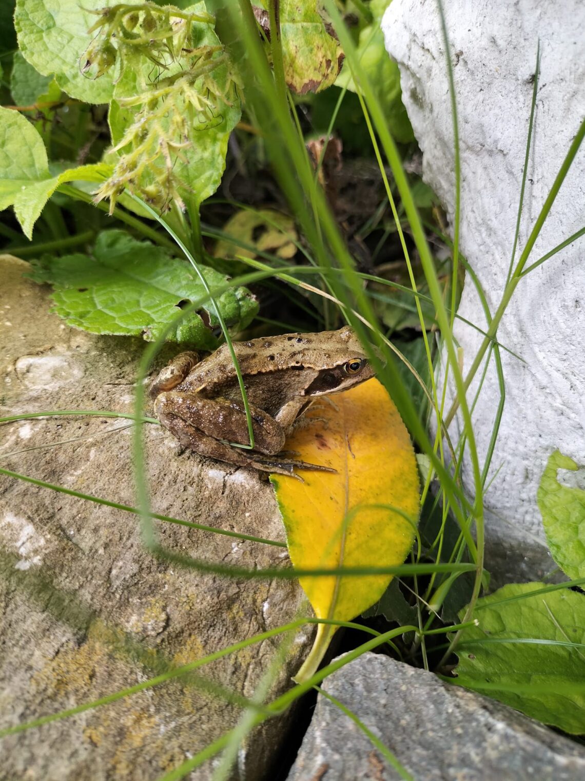 Bij ons verstoppen de kikkers zich graag onder de smeerwortel die naast de vijver staat.